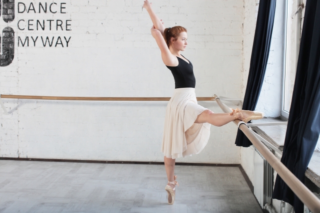 バットマン・ルルヴェ・ランはアダージオで行われます。バットマン・タンデュで出した脚の膝を伸ばしたまま、ゆっくりと上に上げます。