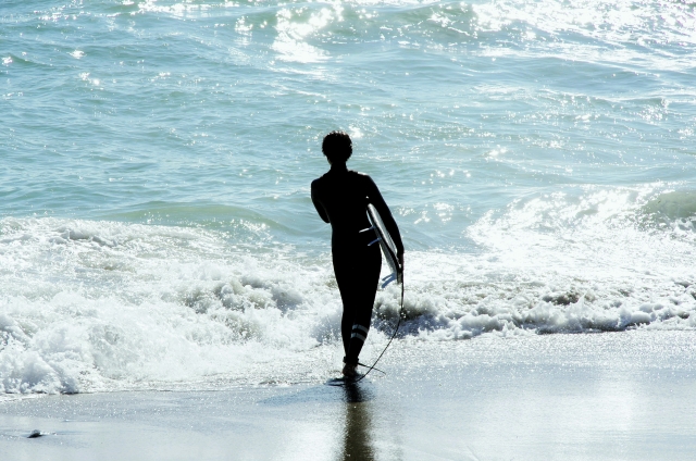 海でよく見ているとボードと体をつないでいるコードみたいなものを腕に巻きつけています。